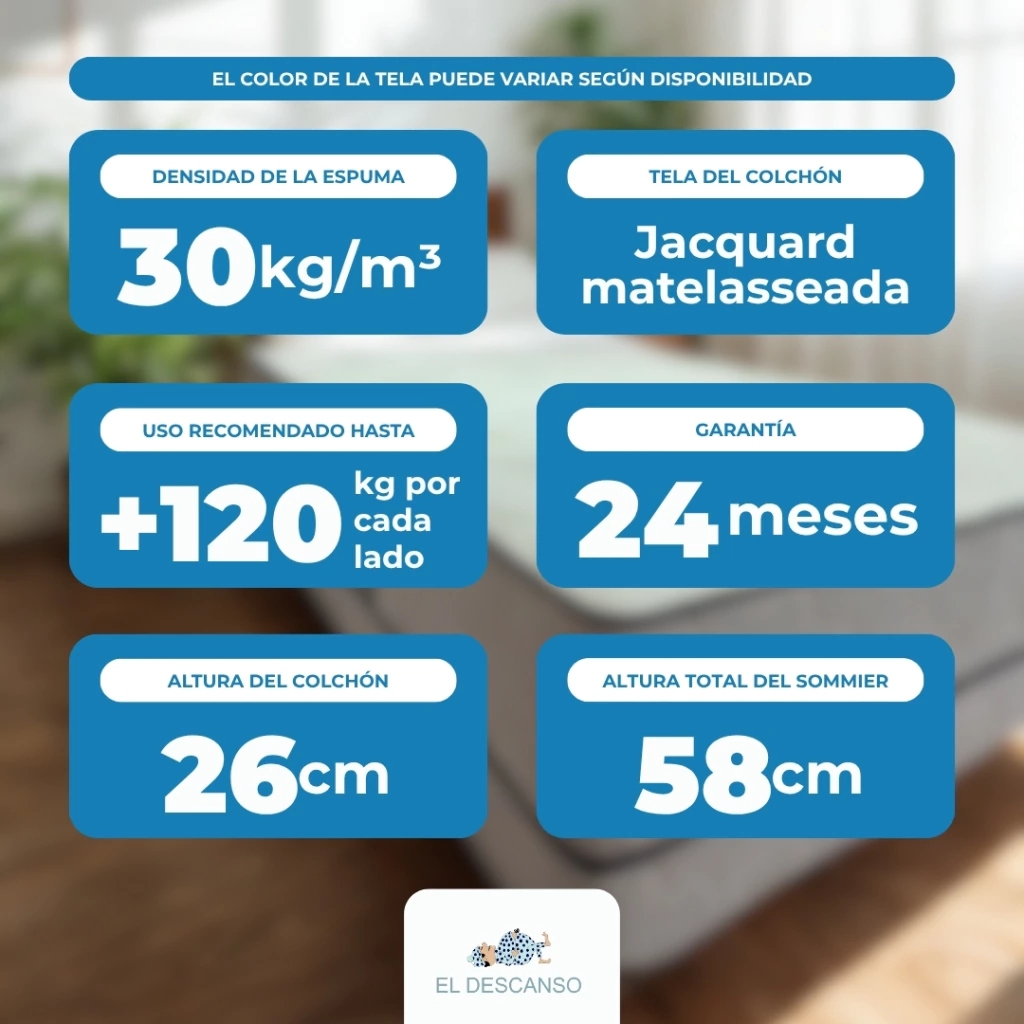 Disfrutá de un descanso superior con este sommier que combina espuma de alta densidad 30kg y una altura de colchón de 26cm, ideal para soportar hasta 120kg por lado. Su base de madera con 7 patas de plástico garantiza estabilidad, mientras que los aireadores y manijas facilitan su movimiento. La tela de almogón matelaseada aporta suavidad y elegancia. Altura total: 58cm. Garantía de 24 meses. El diseño y color de la tela pueden variar según stock.