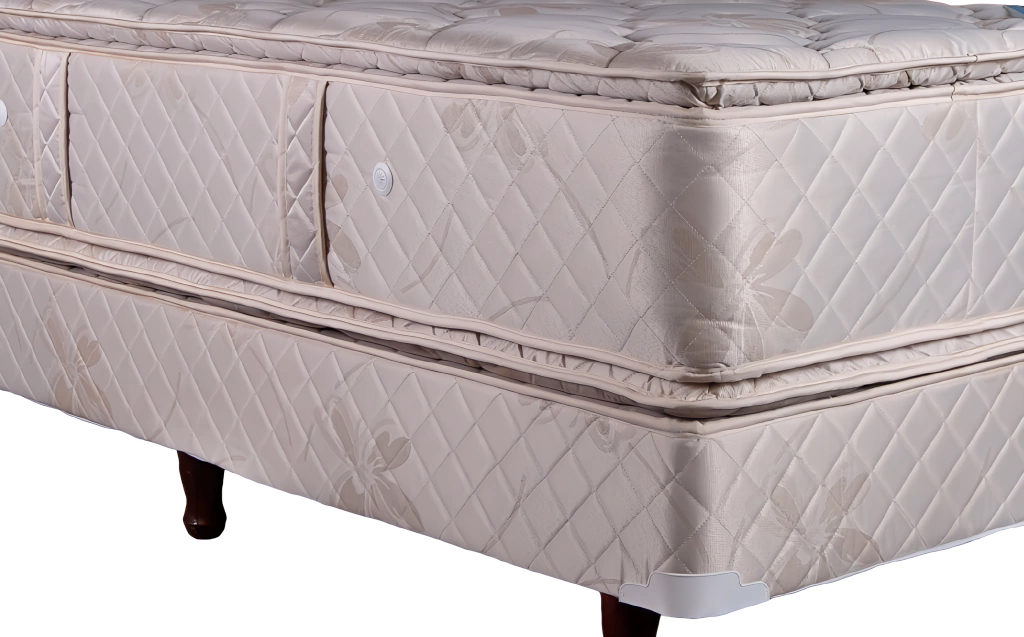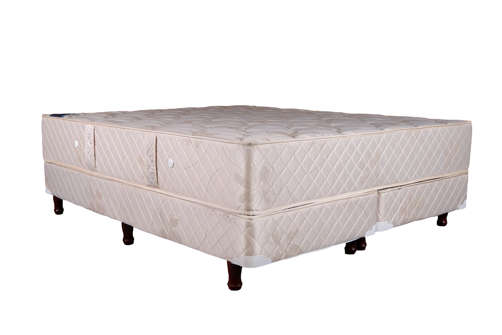 Descansá en la máxima comodidad con este sommier Super King. Cuenta con resorte Bonell y marco de acero perimetral con estabilizadores para un soporte firme y duradero. Su colchón de 29 cm de altura tiene refuerzos internos de espuma de 24 kg de densidad, ideal para personas de hasta 100 kg por lado. Incluye aireadores y manijas para facilitar su traslado. La base de madera con 6 patas de plástico por unidad garantiza estabilidad. La tela jacquard matelaseada aporta elegancia y suavidad. Altura total: 61 cm. Garantía de 18 meses.